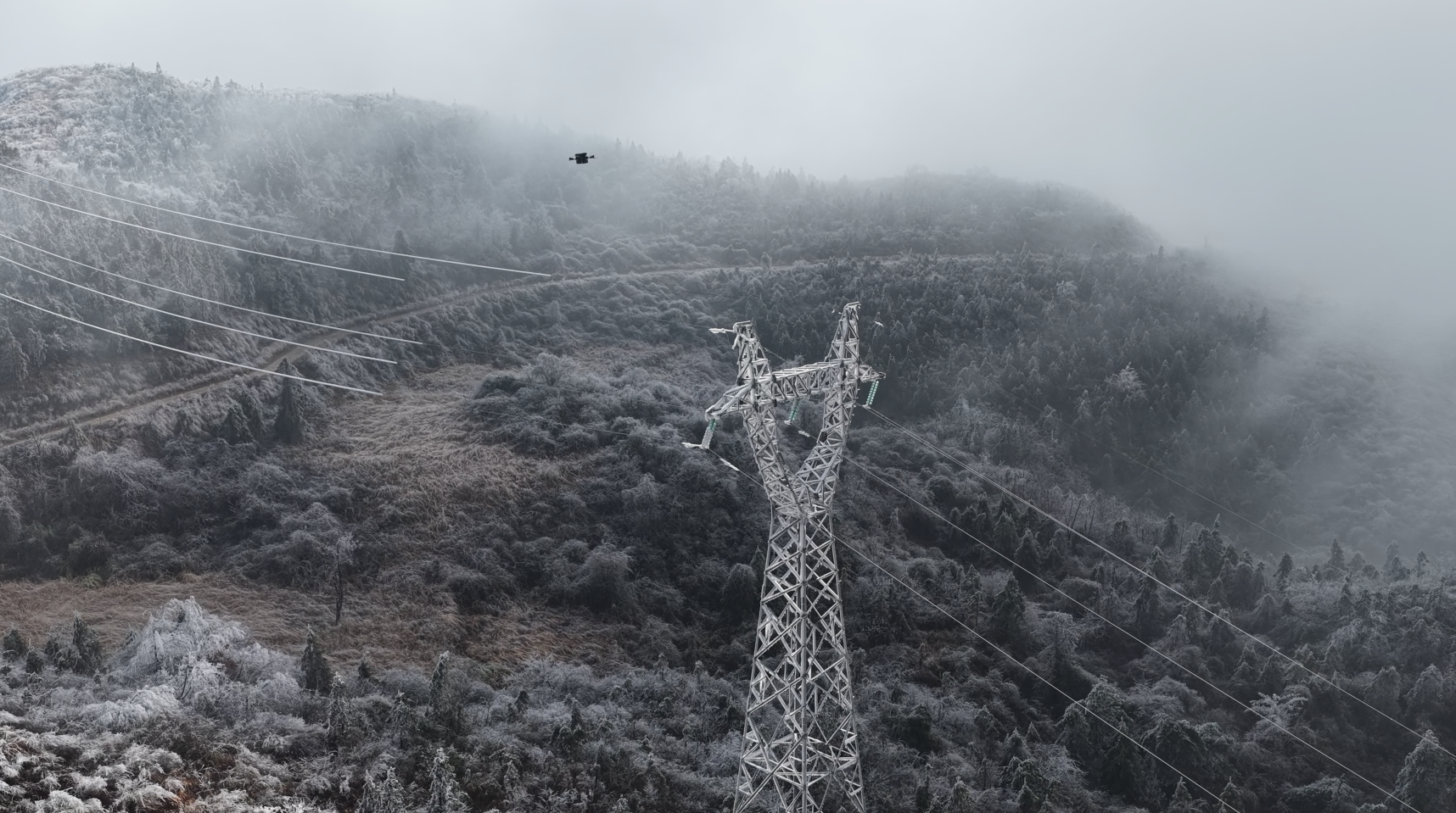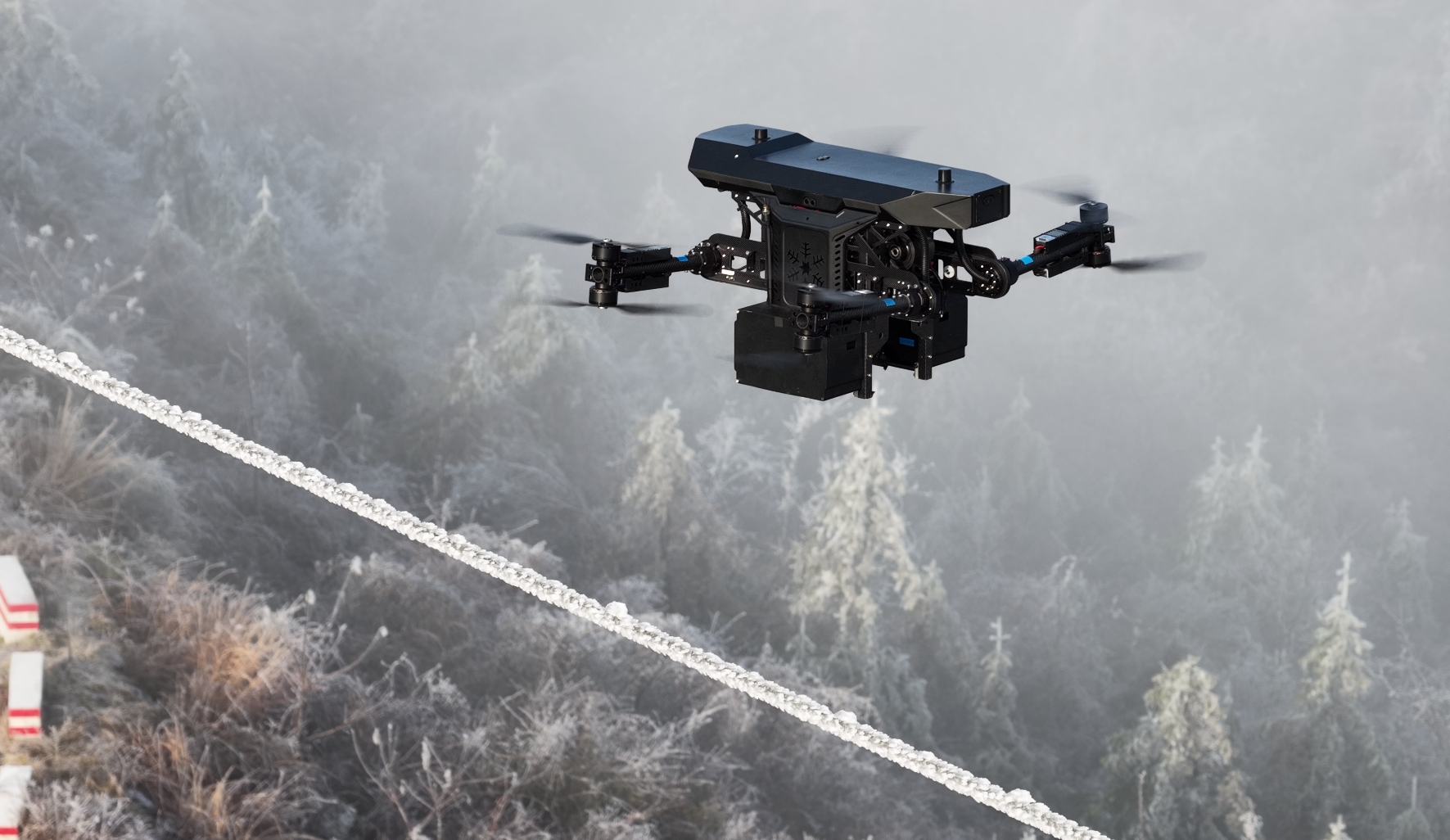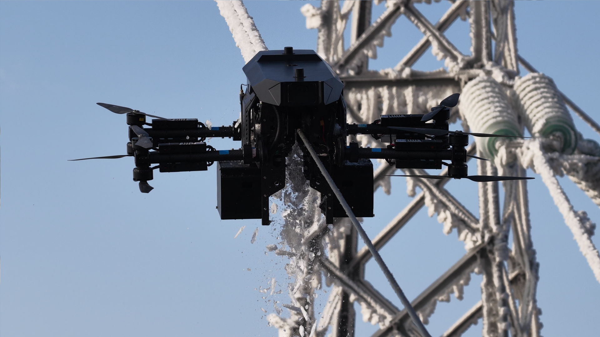 搭载先进多模态传感器系统的机器人,快速捕捉到覆冰地线的位置信息,在复杂环境中精准锁定目标地线,即便现场能见度受低温影响有所下降,仍可实现覆冰地线的快速识别与精准定位,最后稳稳地降落在覆冰地线上。